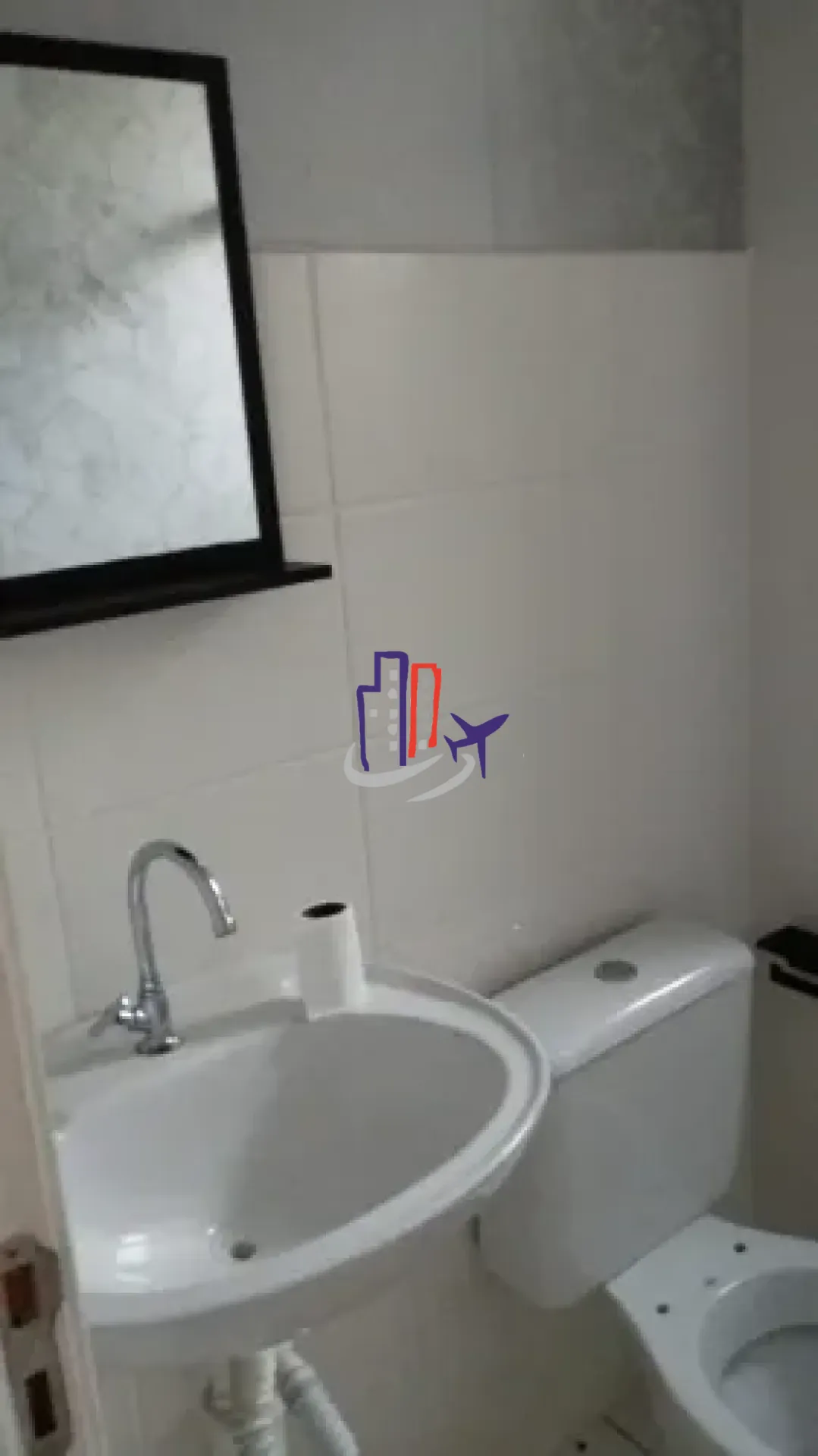 Banheiro social com revestimento cerâmico até o teto, box e armário